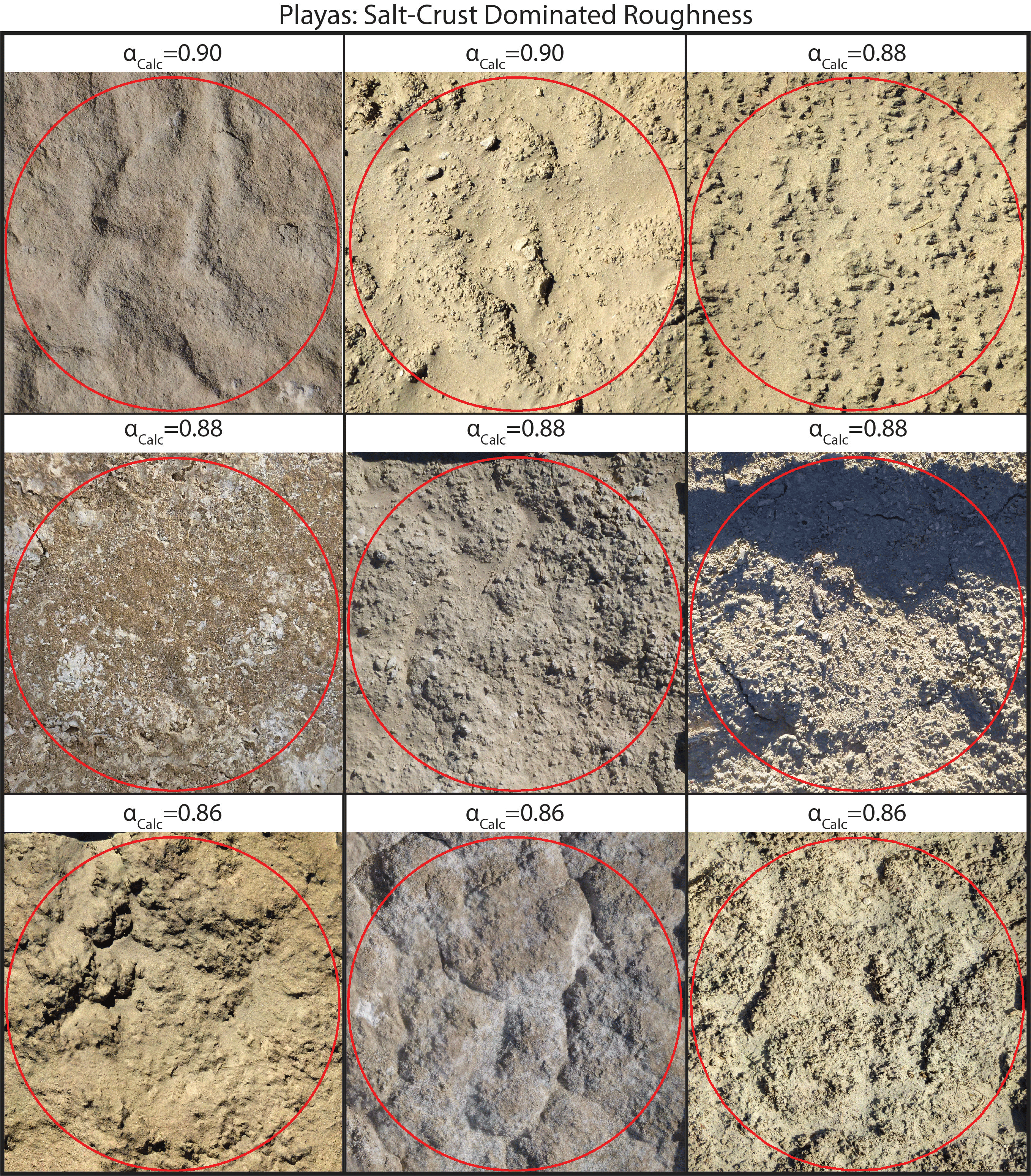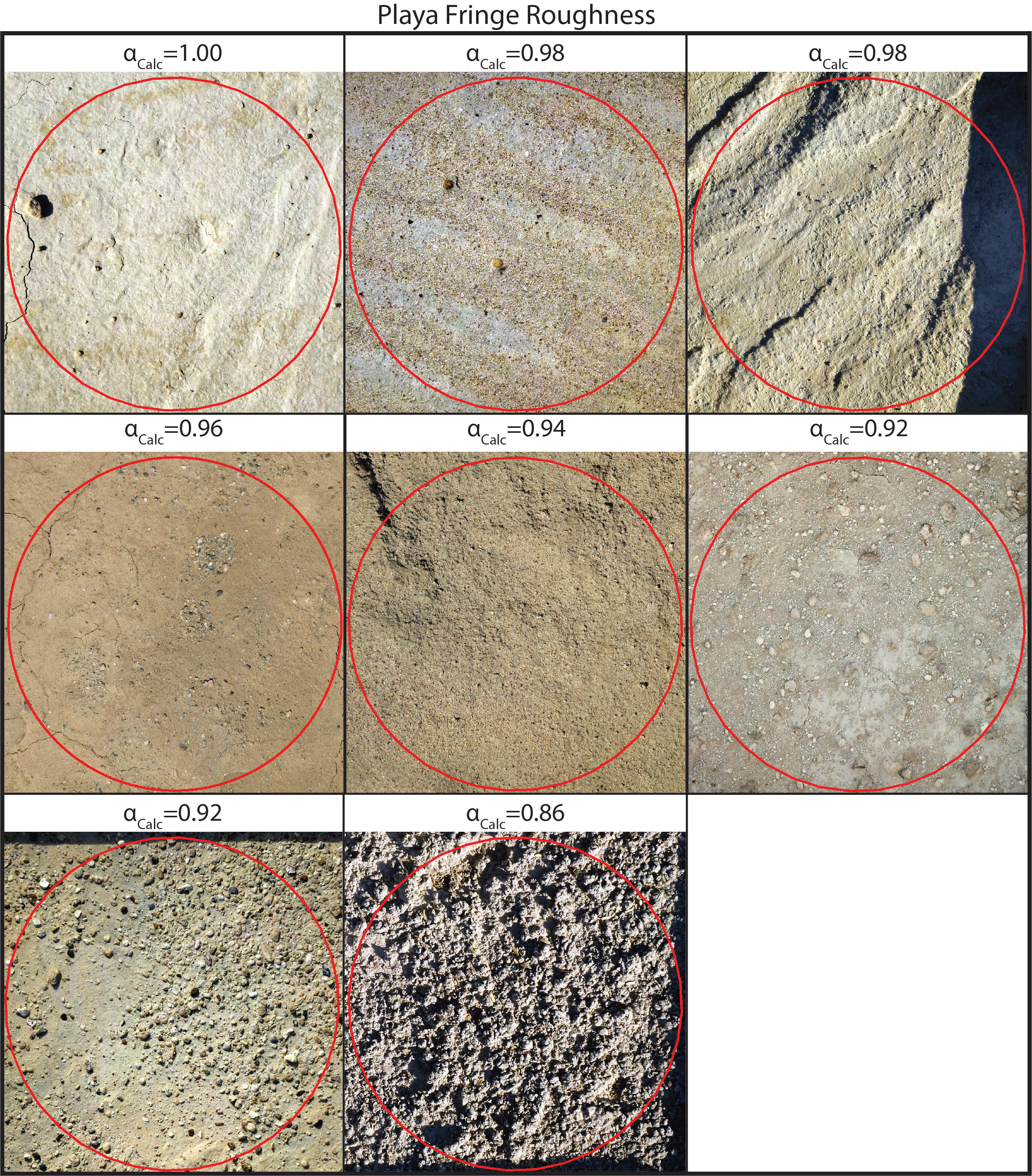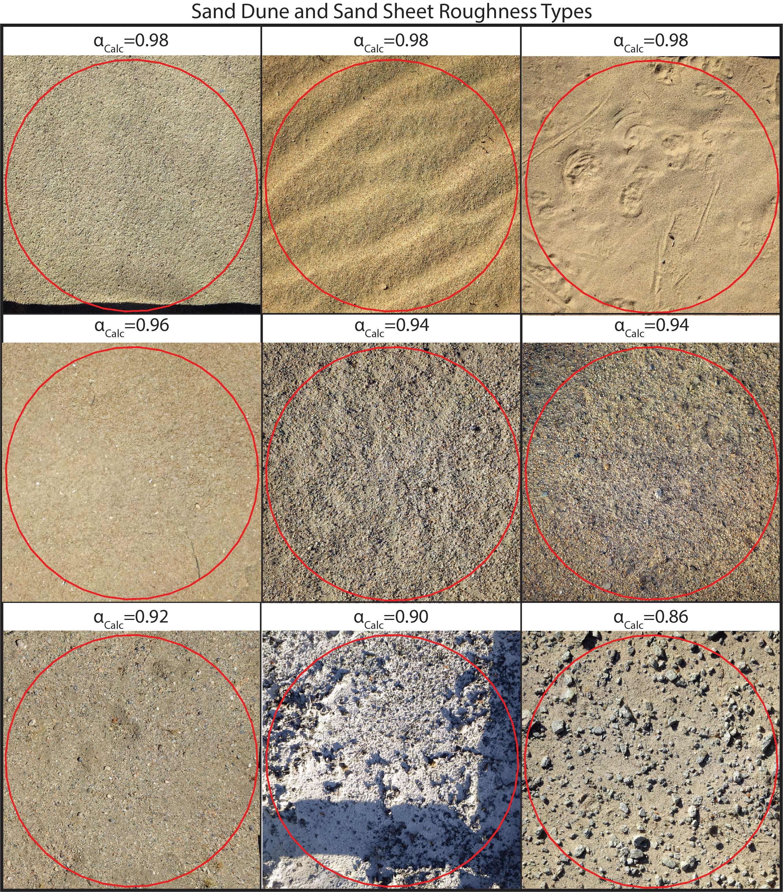 Below is a database of surface roughness of emissive desert landforms. The surface roughness parameter, alpha (α), has been calculated directly from a high-resolution microtopographic Digital Elevation Model. Visual comparison of high-resolution images alongside calculated α values are compiled here for commonly encountered field surfaces. These are presented as a new look-up table for assigning α values to field surfaces for correcting PI-SWERL measurements for surface roughness, expanding on the look-up table of Etyemezian et al. (2014). Consistent visual comparison to these surfaces when assigning alpha will remove some of the subjectivity in assigning α values, further constraining an important source of error that exists in current PI-SWERL methodology.