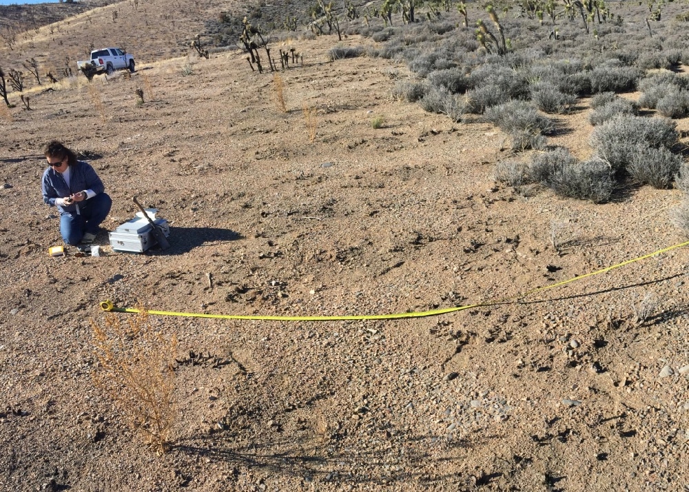 Researcher Rose Shillito from DRI collects soil samples in a burned area in the Humboldt-Toiyabe National Forest near Las Vegas on January 6, 2015, approximately 18 months after the area burned in the Carpenter 1 fire of 2013. Credit: Teamrat Ghezzehei, UCM.