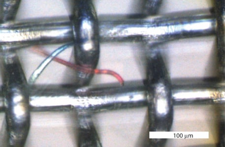 Photo caption: (Above, left) Using a custom-made lint catcher, citizen scientist volunteers in the Tahoe Basin will help collect data for a new study on dryer lint. (Above, right) Closeup image of microfibers found in snow from Sierra Nevada. Fibers such as these are potentially emitted from the drying process. Credit: DRI.