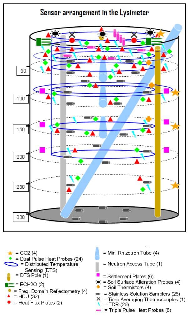 When the soil was installed, four conservative tracers were applied uniformly at four depths from 0.49-1.8 ft (0.15-0.55 m). Each lysimeter is instrumented with 153 sensors installed at 15 different depths from 0 to 9.5 ft (250 cm). The sensors include 17 different instruments for measuring soil, water, gas, and temperature profiles. These data loggers can be accessed remotely so investigators can monitor individual sensors and weather systems as needed.